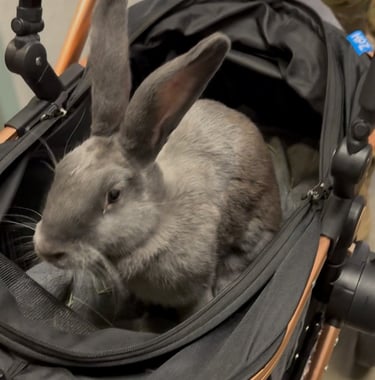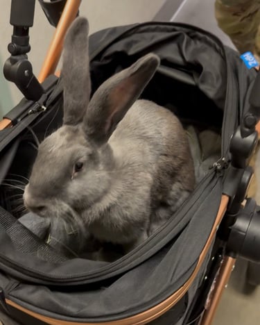 Hi, I’m Storm! I am a “true blue” Flemish Giant rabbit currently in the process of becoming a therapy bunny! I was adopted from a rabbit rescue when I was 6 months old. I am very friendly, curious and enjoy meeting others and riding around in my stroller during my outings. I currently enjoy hanging out in the office during virtual sessions and making others smile.